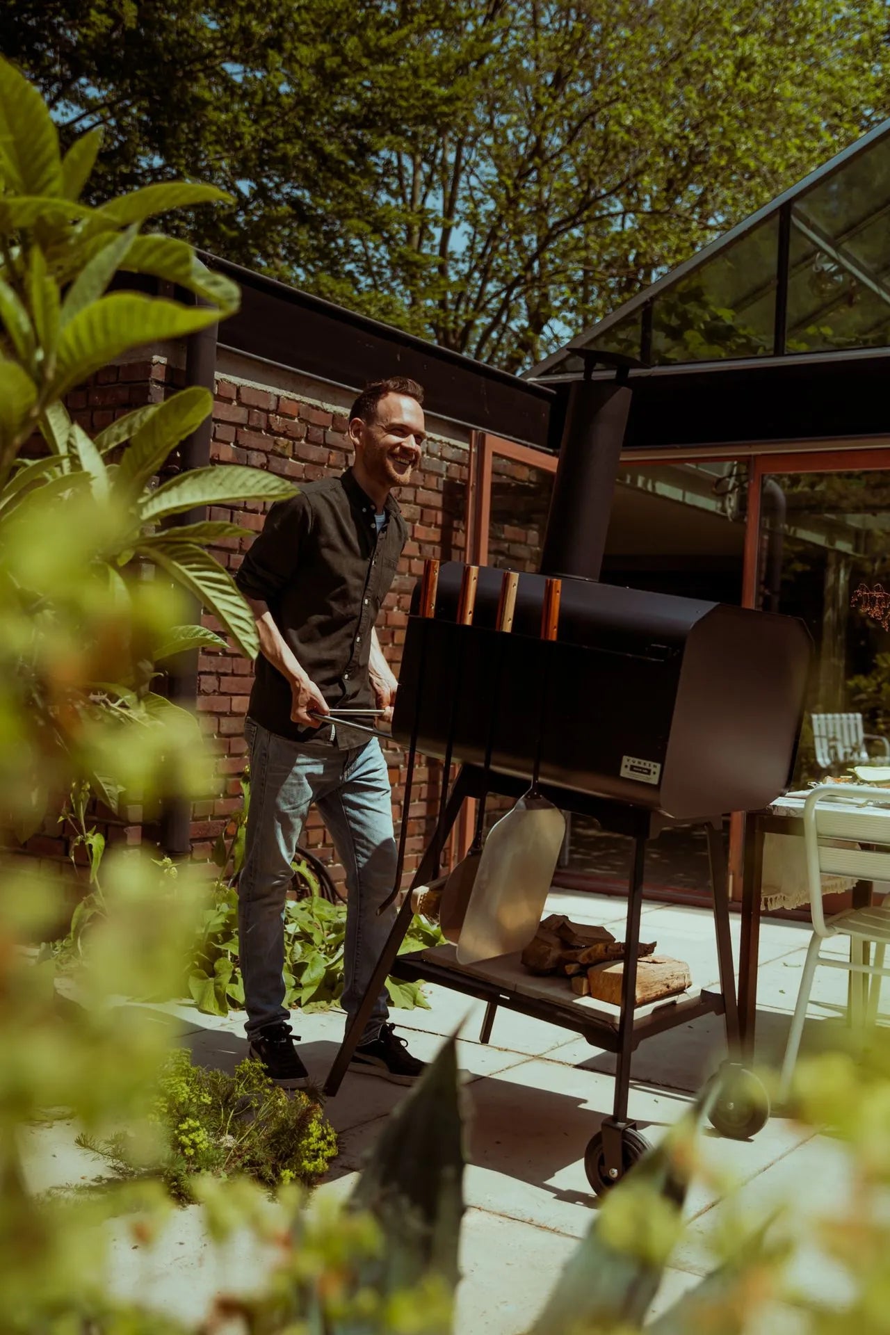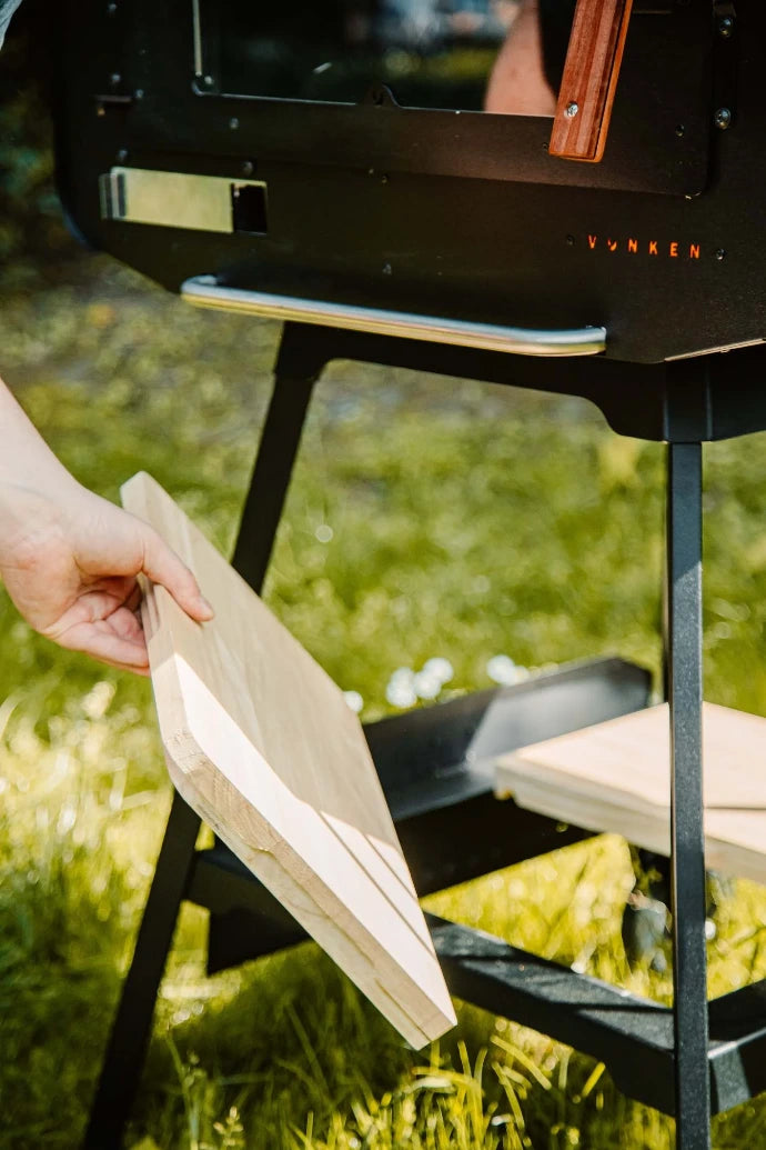 Dank unserer Click'n Roll-Technologie lässt sich der Ofen einfach und reibungslos ohne zusätzliche Schrauben montieren. Das praktische Lift-and-Roll-System macht das Verschieben des Ofens zum Kinderspiel. Dank der stabilen, großen und robusten Rollen können Sie den Ofen praktisch überall platzieren und schieben, sogar auf Terrassen und in Gärten. So rücken Sie Ihren Vonken näher an den Tisch und genießen nach dem Essen seine wohlige Wärme. Im Lieferumfang enthalten ist unser Wood & Food Board, ein praktisches Schneidebrett, das dank seiner schönen Gravuren perfekt in den Griff Ihres Vonken passt oder in die Basis einklickt