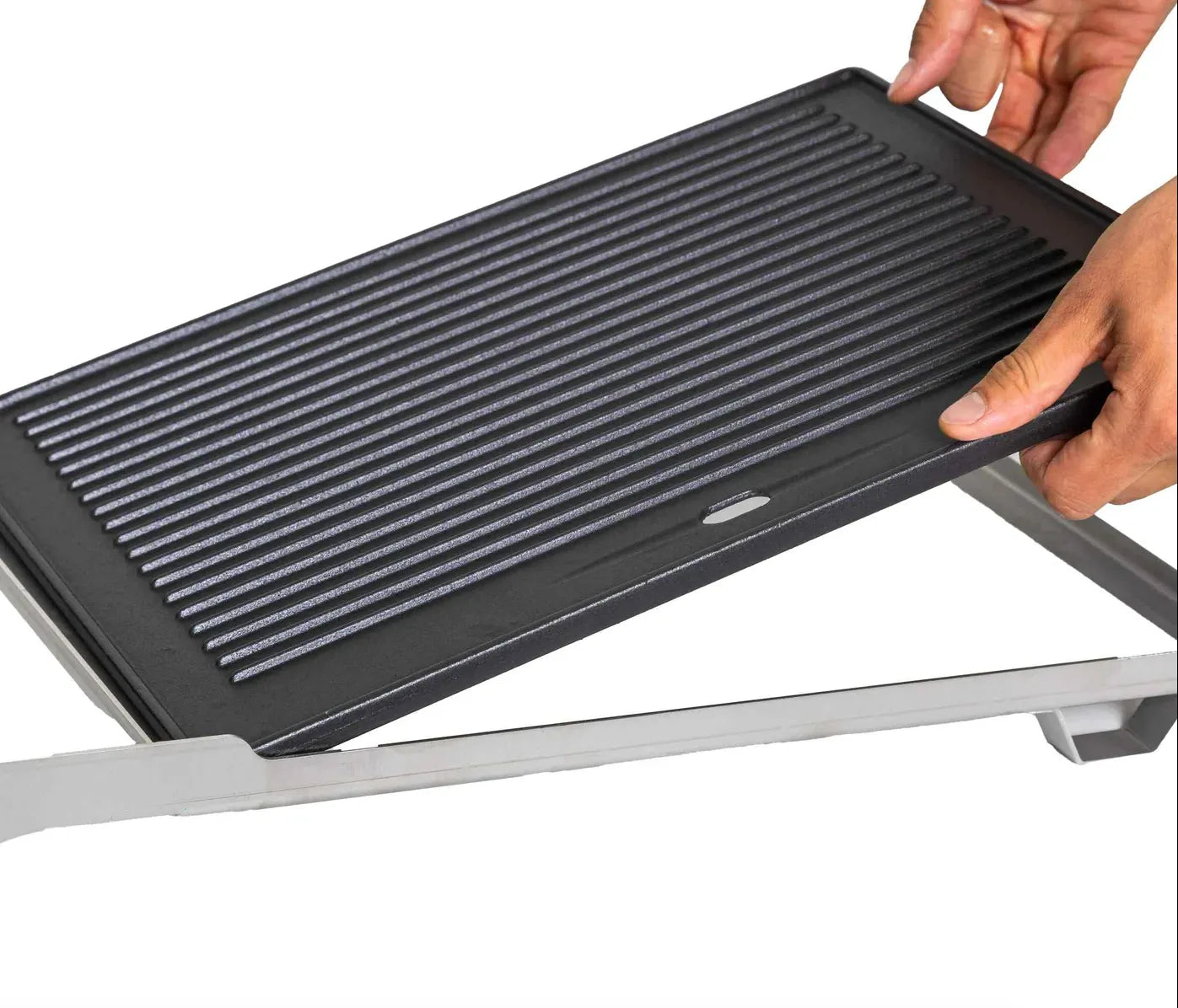 Der ausziehbare Rost mit doppelseitiger Grillplatte bietet dir maximale Flexibilität – nutze die glatte Seite für empfindliche Speisen wie Jakobsmuscheln und Fisch, die geriffelte Seite für Fleisch und Spargel mit authentischer Grilltextur.