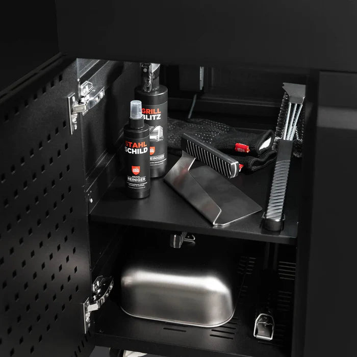 Der Einlegeboden lässt sich in wenigen Minuten hinter jede 16er Tür einbauen und sorgt so für eine praktische Ordnung Deiner Grillutensilien.